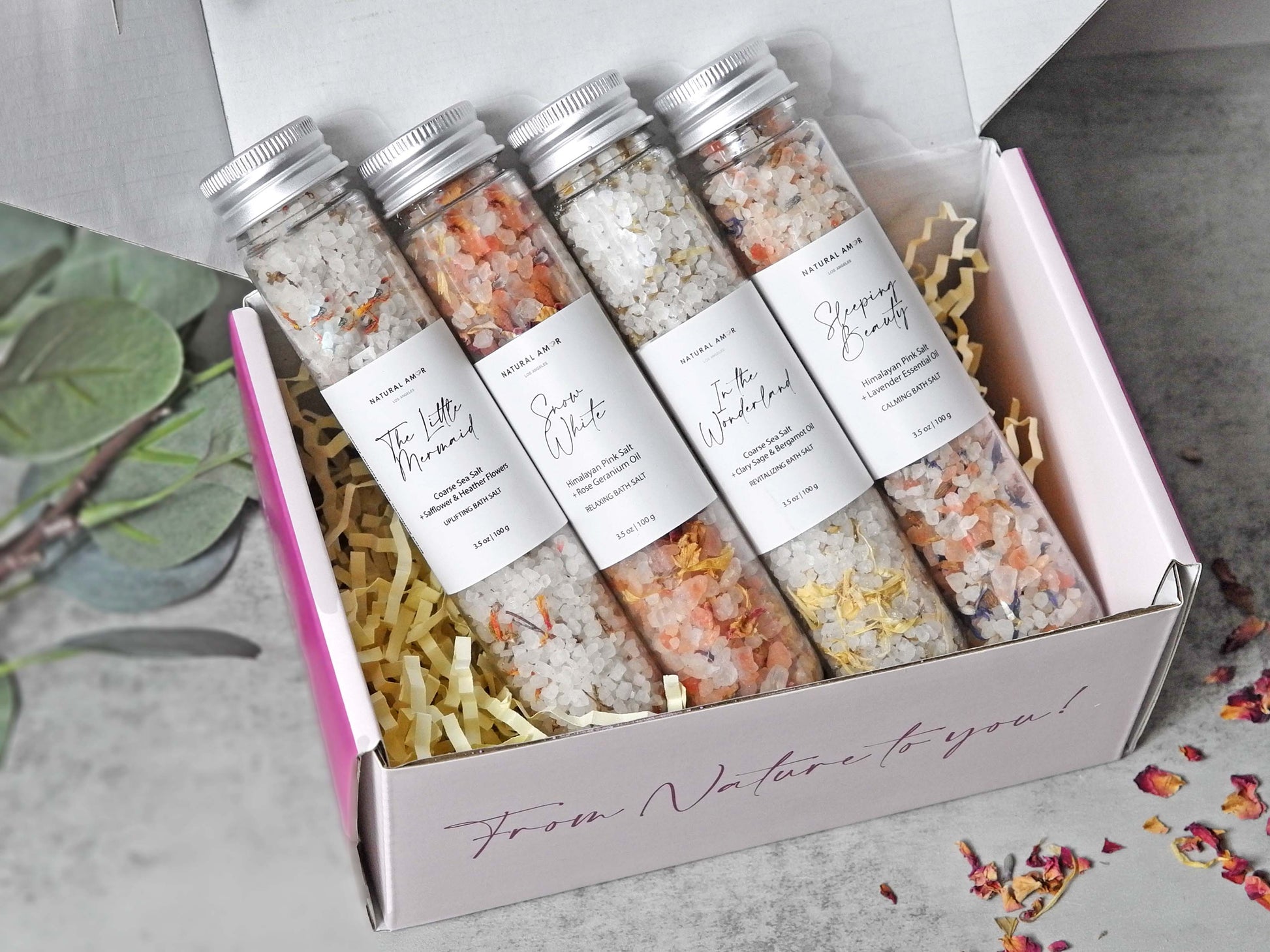 Himalayan Pink Salt, Rose Geranium Oil, Ylang Ylang Oil, Jasmine Oil, Jojoba Oil, Dried Rose Petals, Dried Calendula
