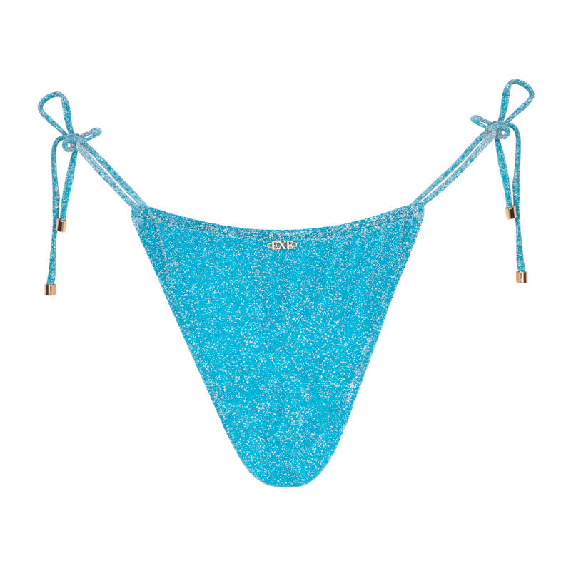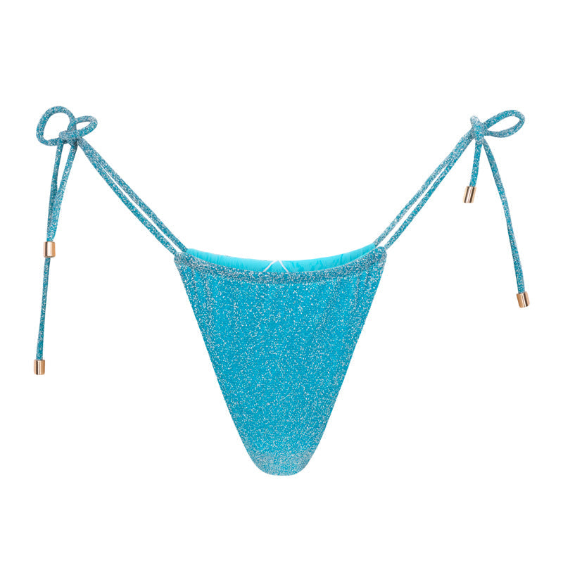 A side-tie bikini in blue glitter fabric. Fully adjustable bottoms with self-tie fastenings. Can be worn as a thong or adjusted to cheeky coverage.