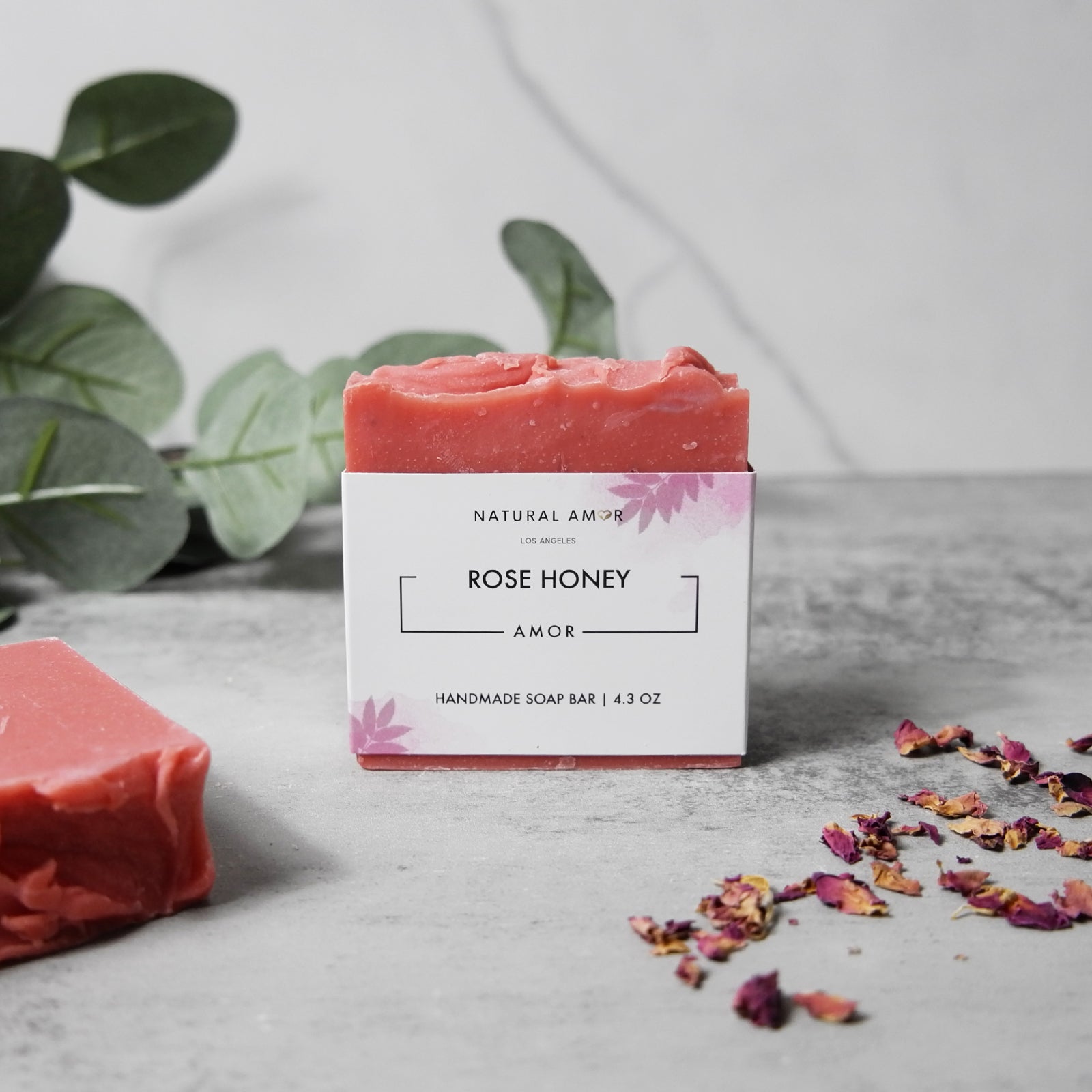 “Rose Honey Amor” soap bar is handmade with 100% natural ingredients through traditional cold process method to best preserve the nutrients and effectiveness of those gorgeous oils including pure olive oil, organic coconut oil. Enriched with organic shea butter, castor oil to provide creamy and rich lather and leave your skin deeply cleansed and hydrated. The amazing romantic rose scent with a hint of sweet vanilla is from natural rose geranium essential oil to make you feel and smell amazing.  Real organic honey is an additive in this amazing bar, which makes it gentle, soft and smooth on your skin.